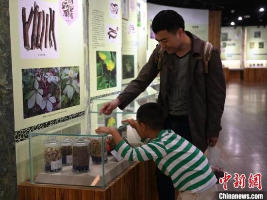 嚴(yán)進(jìn)軍帶著6歲的兒子參觀中醫(yī)藥博物館。 張瑤 攝