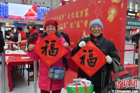 沈陽鐵路公安局長春公安處的民警在為旅客送福字。張瑤 攝