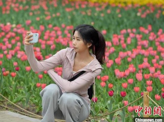 民眾在盛開(kāi)的郁金香旁打卡拍照。