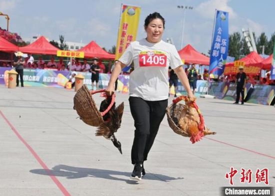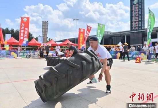 8月16日,吉林長春,農(nóng)民趣味運動會在長春農(nóng)博園精彩上演,運動會設(shè)置了“喜獲豐收”“回娘家”“農(nóng)田大力士”等充滿鄉(xiāng)村特色的比賽項目。圖為選手在“喜獲豐收”比賽中。中新社記者 張瑤 攝