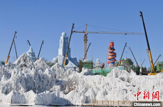 12月11日,吉林長(zhǎng)春,工作人員正在長(zhǎng)春冰雪新天地緊張施工。今年長(zhǎng)春冰雪新天地總占地面積達(dá)到156萬平方米,冰雪雕塑200組創(chuàng)歷屆之最,并設(shè)置1314米的空中雪漂流、520米的冰滑梯等設(shè)施供中外游客游玩。中新社記者 張瑤 攝